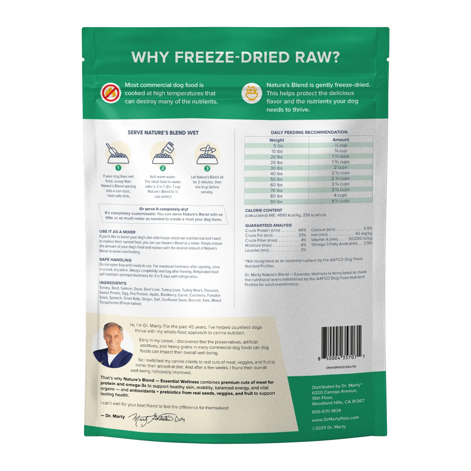 All ingredients in Nature’s Blend dog food are freeze-dried to deliver optimal nutrition to your dog… and save you money on shipping. Nature’s Blend contains: Turkey, Beef, Salmon, Duck, Beef Liver, Turkey Liver, Turkey Heart, Flaxseed, Sweet Potato, Egg, Pea Protein, Apple, Blueberry, Carrot, Cranberry, Pumpkin Seed, Spinach, Dried Kelp, Ginger, Salt, Sunflower Seed, Broccoli, Kale, Mixed Tocopherols (natural preservative)
