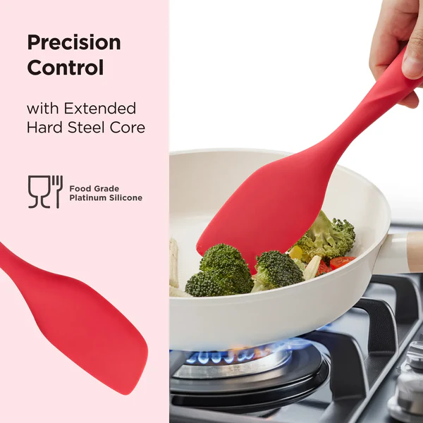- Wide Pancake Turner: Featuring an extra-wide, slotted design and a durable stainless steel core, this silicone turner is ideal for flipping large foods like pancakes, omelets, and burgers. Its sturdy construction prevents bending, ensuring reliable performance every time
